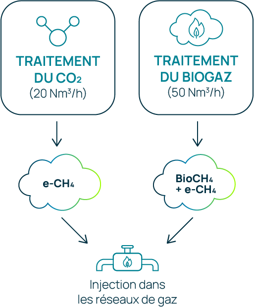 La première consistera à traiter le CO₂ (20 Nm₃/h) rejeté par l’installation d’épuration du site de méthanisation, la deuxième à traiter directement le biogaz (50 Nm₃/h). Le gaz produit (du e-méthane, ou un mélange de biométhane et de e-méthane) sera injecté dans le réseau de gaz naturel exploité par GRDF.